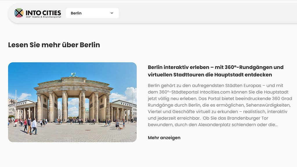 Unsere Rundgänge verbinden eindrucksvolle 360°-Ansichten mit interaktiven Points of Interest, Such- und Filterfunktionen sowie zusätzlicher Präsenz im Städteportal intocities.com – für maximale Reichweite und Sichtbarkeit.